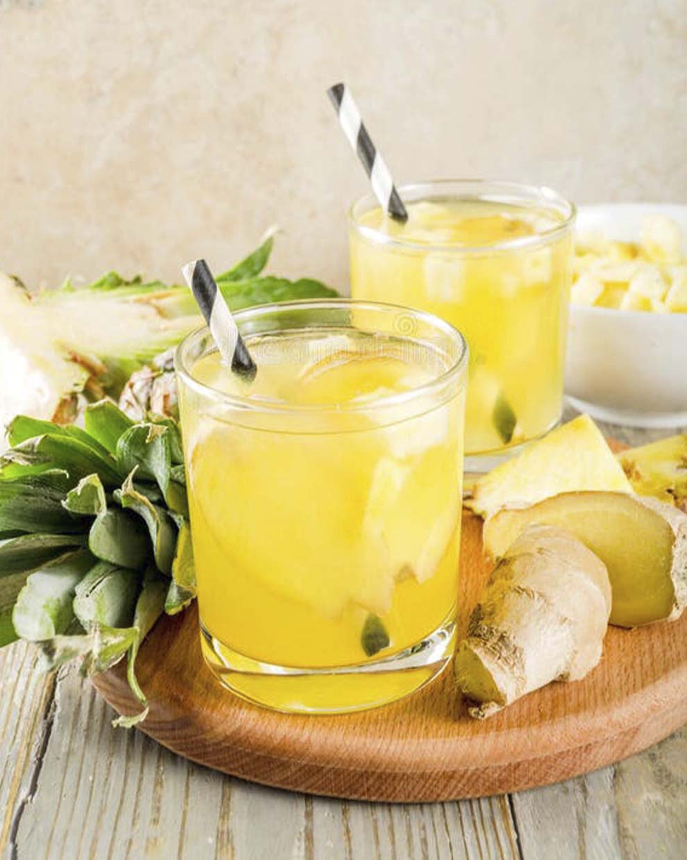 A warm beverage made by infusing ginger and pineapple in hot water.